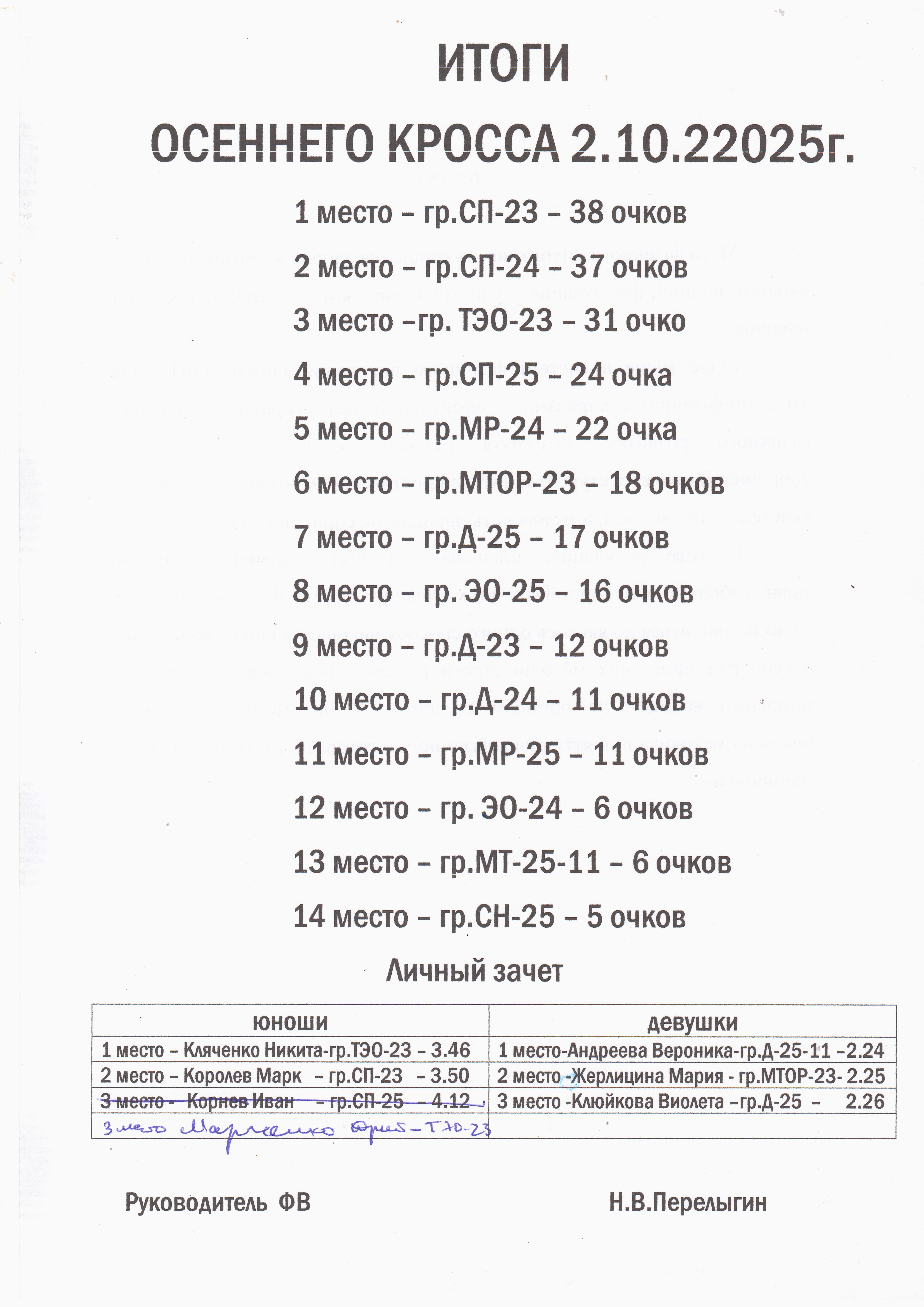 В колледже ежегодно проводится Спартакиада по 11 видам спорта среди студентов 1-3 курсов. По традиции первым видом проводится осенний кросс. Места распределились следующим образом: 1место – гр. ТЭО-22-1/9, 2 место – СП-23-1/9, 3 место – гр. Д-24-1/9.