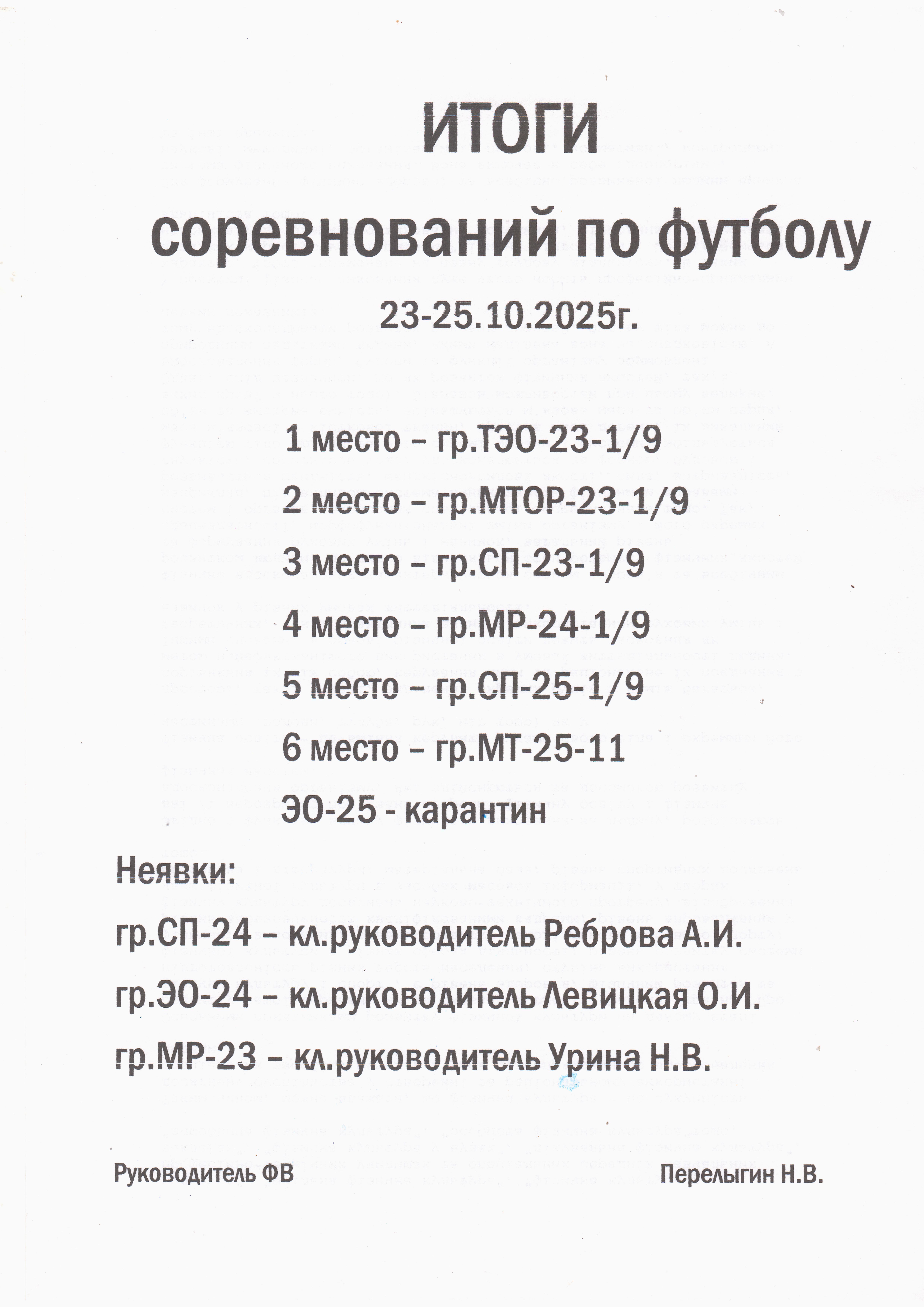18 октября 2024 года состоялось Первенство колледжа по футболу среди студентов 1-3 курсов при содействии РОО «Народная Дружина».