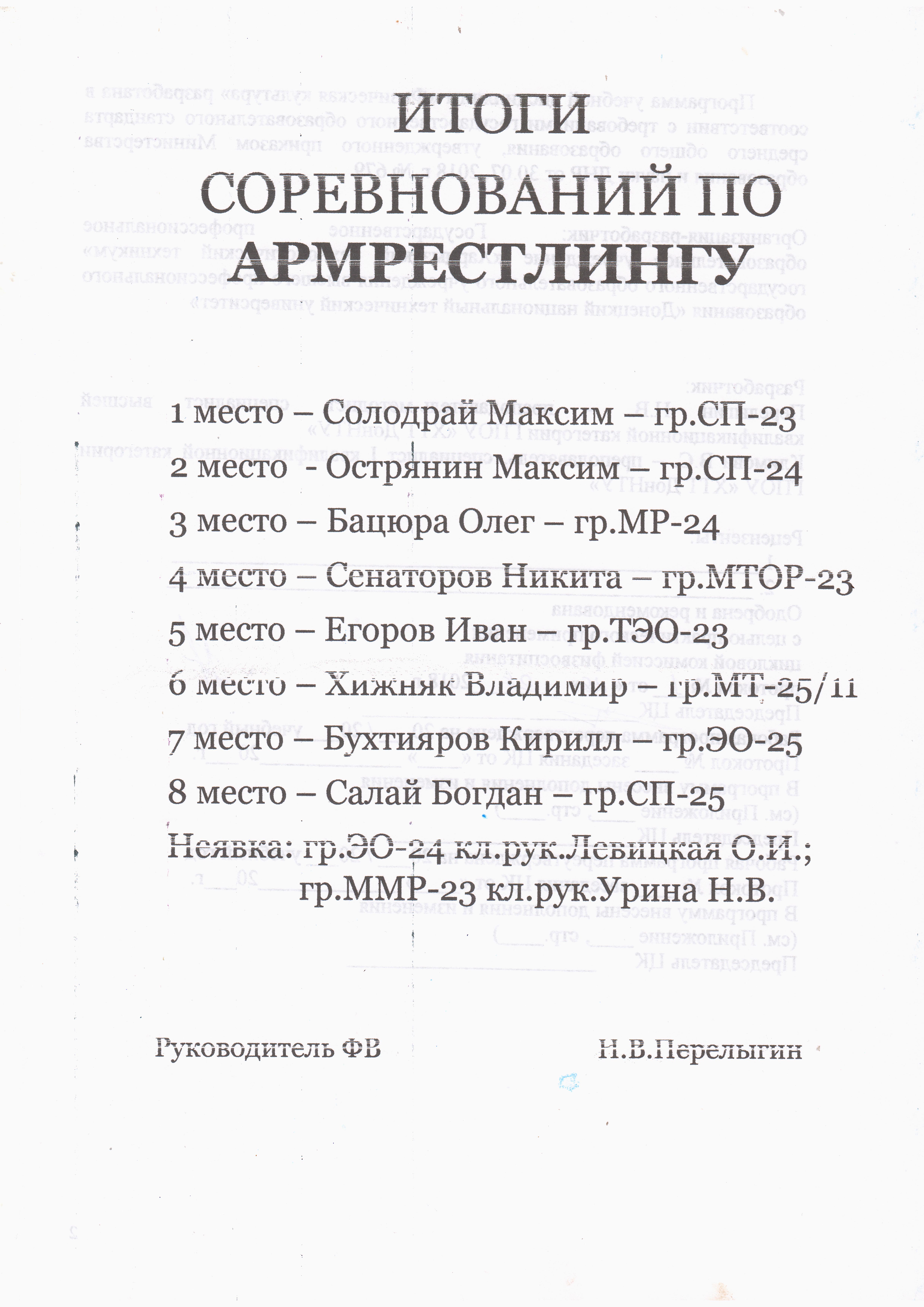 Среди юношей: 1 место Ляускин Родион (гр. МТОР-22-1/9), 2 место – Линник Александр (гр. СП-23-1/9), 3 место – Забродченко Никита (гр. ММР-23-1/9).