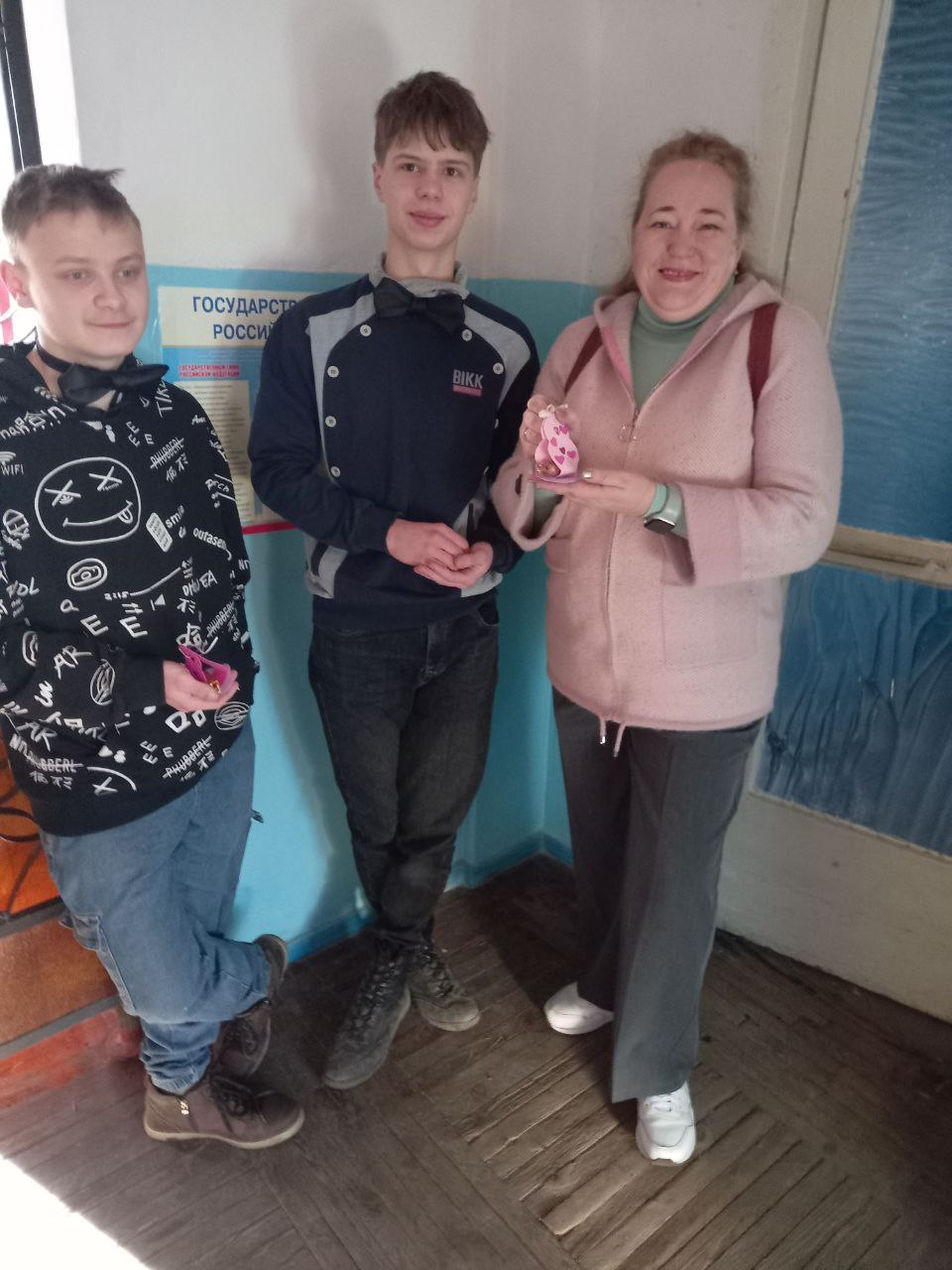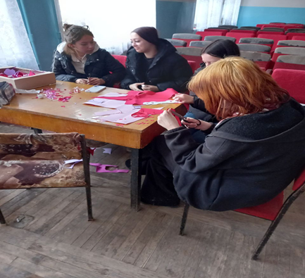 В преддверии праздничной даты советник директора по воспитанию Емец Л.Н. совместно со студентами группы Д-24/9,СП-22/9 и СП-23/9 провели акцию «Вам, Любимые», в рамках которой студенты изготовили поздравительные открытки и декор фотозоны для праздничного мероприятия. Акция состояла из двух этапов: